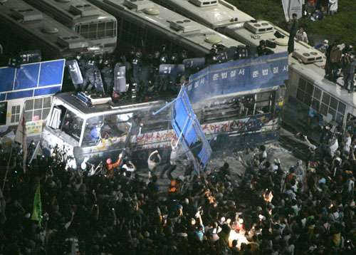 另外,韓國首都首爾昨天清晨的4萬人燭光集會示威演變成暴力沖突,延至日出后才平息。示威者用棍棒攻擊警員,又用梯子擊碎用作路障的防暴巴士的窗戶,并試圖推翻巴士,警方則以防暴盾牌還擊,據(jù)報(bào)雙方更曾在巴士車頂上開戰(zhàn)。組織示威者表示最少有20名示威者受傷,首爾大學(xué)醫(yī)院則指治療過6個(gè)人,已全數(shù)出院。據(jù)悉亦有警員受傷,及11名示威者被扣留問話。