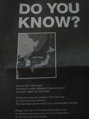 這一廣告刊登于《紐約時報》7月9日A15版,標題為“您知道嗎?”(Do you know?)。廣告上刊登了朝鮮半島周邊地圖以及“在過去的2000年里,韓國和日本之間的海一直被稱為東海,位于東海的獨島是韓國的領土。日本政府必須承認這個事實”的內容。廣告中還建議“韓國和日本應該讓下一代了解歷史的真相,同時,兩國從現在開始就應為東北亞的和平與繁榮共同努力”,并留下了韓國歷史宣傳網站“為了下一代()”的網址,以便讓《紐約時報》的讀者可以看到更詳細的內容。