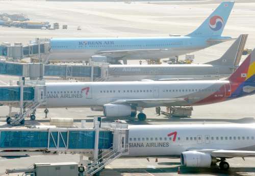 韓國大韓航空和韓亞航空的飛機停在首爾機場。