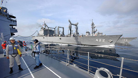 兩艘護衛艦14日從日本廣島縣吳基地出發,28日曾接受依據新《反恐特措法》在印度洋執行任務的海上自衛隊補給艦的供油。