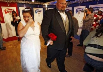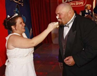 新娘穿的潔白婚紗是用數卷廁紙精制而成,由本年度廁紙結婚禮服比賽冠軍哈納•金設計。廉宜時髦結婚公司對本次婚禮提供了贊助。