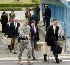 據悉,金成一行攜帶7只可能裝有有關朝鮮核開發計劃相關文件的箱子通過板門店。他們預計將在首爾向韓國外交通商省負責人通報本次訪問結果后,于12日返回美國。