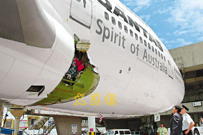 據(jù)香港《文匯報》報道,這架澳航QF30客機(jī),25日晨9時由香港起飛,原定當(dāng)?shù)貢r間晚上約10時飛抵墨爾本,但在起飛約1小時后,機(jī)身近右邊機(jī)翼部分突然傳出巨響,機(jī)師決定緊急降落馬尼拉,11時左右安全著陸后,機(jī)上346名乘客和19名機(jī)組人員無人受傷。