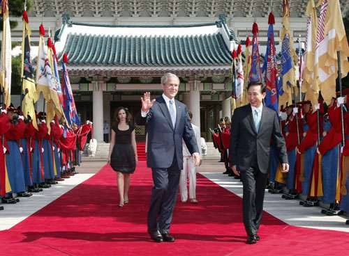 據(jù)香港《大公報(bào)》報(bào)道,李明博六日上午在青瓦臺(tái)以三軍儀仗隊(duì)歡迎布什后,即進(jìn)行韓美高峰會(huì)談,雙方就今后同盟的發(fā)展方向一致認(rèn)為,有必要繼續(xù)加強(qiáng)聯(lián)合防御力量、執(zhí)行移交戰(zhàn)時(shí)作戰(zhàn)指揮權(quán)、履行駐韓美軍基地遷移及重新部署的協(xié)議。