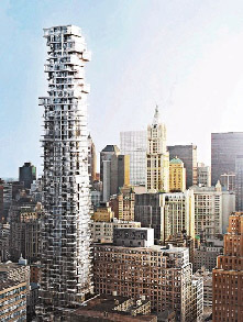 中新網(wǎng)9月15日電 為北京奧運會“鳥巢”體育館進行設(shè)計工作、受到各方贊嘆的兩位瑞士建筑設(shè)計師赫爾佐格(Jacques Herzog)和德默隆(Pierre de Meuron),將會把他們的創(chuàng)意帶到紐約。他們參與在紐約市內(nèi)興建一座透明玻璃摩天大樓。當(dāng)這座建筑物在后年建成后,驟眼看好像一層層單位半浮懸在空中,令人類幻想中的“空中樓閣”活現(xiàn)眼前。