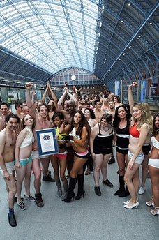 在倫敦的圣潘克拉斯車站,尋求締造最多人聚在一起僅身穿內衣的世界紀錄,同時有數百人脫得只剩內衣,民眾不禁側目(見圖)。