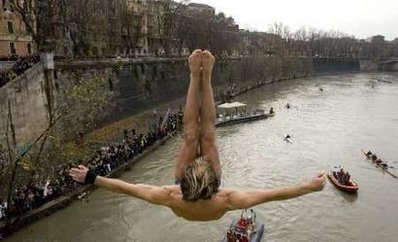 據臺灣“東森新聞”報道,當你看到綽號“泰山”的男子,又出現在意大利臺伯河上方時,你就知道新的一年又來了!他將從大橋上一躍而下,高度總共有17米,救難人員已經在一旁待命;當他優雅地跳到臺伯河中,救難人員立刻開救生艇過去拉他一把。