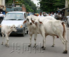 印度路上的牛很多是以前被飼養(yǎng)因產(chǎn)不出牛奶或變老而被拋棄,或是因放養(yǎng)而闖到路上的。在印度禁止食用作為神靈的“牛”肉。就沒有人想要抓那些迷路的牛。即使那些牛在道路中間成為交通的障礙,在路上逆行,市民們也都會(huì)避開。