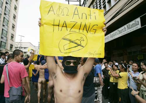 菲律賓首都馬尼拉的街頭2日傳出尖叫的歡呼聲,不是什么大明星出現(xiàn),而是當(dāng)?shù)匾凰髮W(xué)兄弟會的成員,以裸奔的方式抗議高漲的學(xué)費,這種犧牲色相的抗議方式馬上引來眾人圍觀,差點引發(fā)當(dāng)?shù)仳}亂。