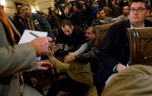 不過,塔拉巴尼的話似乎并不能代表全體伊拉克人民的真實感受。在與馬利基的聯合發布會上,布什講話時,一名伊拉克記者將兩只鞋朝布什扔了過去,并高聲辱罵:“這是伊拉克人民給你的告別之吻!”好在布什身手敏捷,彎腰躲過了襲擊。隨后,馬利基英雄救“美”,用身體擋住了這位美國客人,而那個丟鞋的男子也被保安制服。