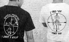 中新網3月24日電 據日本共同社報道,以色列《國土報》日前稱,以軍士兵中最近流行穿一種原創T恤,T恤上印著漠視巴勒斯坦人生命的圖案和文字,例如將瞄準器對準阿拉伯孕婦,并配上“一槍殺兩人”的文字。