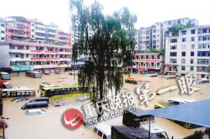 前晚9時許,酉陽縣城開始下起暴雨。昨晨,酉城河水也漫過河床,涌向縣城主街的低洼角落。至上午10時許,縣城東風壩、城北車站、小商品一條街、桃花源中路等街道門面進水,水深1.5米左右,酉陽報社被淹,停放在街邊、車站內的許多車輛被水淹沒。