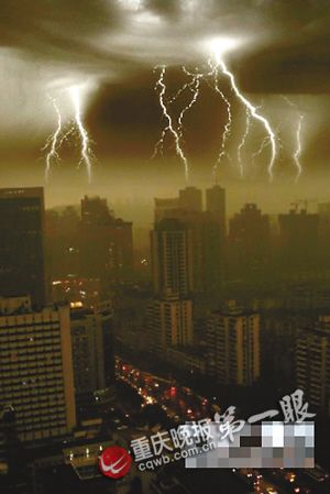 昨上午10時左右,大片的黑色云朵從北向南逼近并覆蓋主城上空,原本已放亮的天空,慢慢地變黑,短短10多分鐘,整個主城區已經宛如黑夜,馬路上的車輛紛紛打開車燈,緩慢行駛。“天黑”沒多久,閃電劃破“夜空”,驚雷緊隨而至,并未經過鋪墊,大雨如注鋪天蓋地砸向地面,突如其來的暴雨,致使主城很多地方的道路產生積水。
