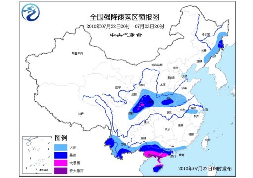 中新網7月22日電 據中央氣象臺網站消息,中央氣象臺7月22日18時繼續發布暴雨黃色預警:預計,7月22日20時到7月23日20時,廣東沿海和西南部、廣西大部、海南、云南西部和南部、四川盆地西部、甘肅東部、陜西中南部、湖北西北部、河南大部、安徽北部和東南部、浙江西北部以及黑龍江東南部、吉林東部、遼寧東北部等地有大雨或暴雨,其中,廣東西南部、廣西南部、海南北部的部分地區有大暴雨或特大暴雨;四川盆地西北部、陜西西南部的局部地區有大暴雨;上述地區局地并伴有短時雷雨大風等強對流天氣。