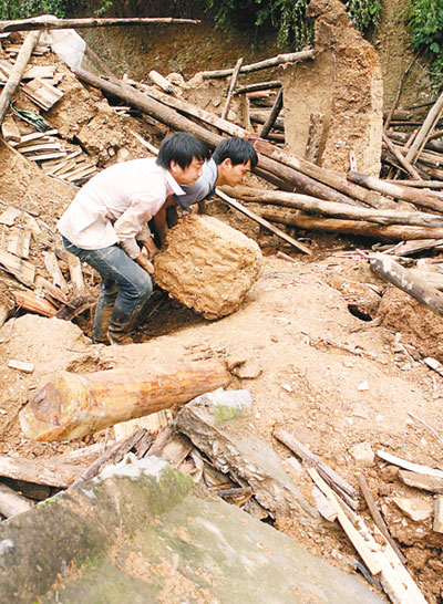 15歲的邵玉乾能撿回一條命完全得益于他的貪玩。24日上午,盡管雨大,他還是帶著小外甥到房子后面的山坡上玩,不巧,小外甥陷到泥里,全身濕透,他跑回去給拿了件衣服。剛到半山腰,突然,腳下好像地動山搖,緊接著“卡啦卡啦”巨大的聲響,像爆炸一樣,山上的泥石流瞬間沖向對面的山坡,又折回頭沖向他這邊。他前面不遠處的一排房子全倒了。他趕緊跑過去看,奶奶被泥石淤在腰部,大聲喊著救命。這時,旁邊有人趕來,幾人用手刨了2個多小時,奶奶終于被救出。但是,邵玉乾的姐姐邵玉娟、妹妹邵玉苗,卻被埋在泥石之下。