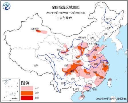 中新網7月30日電 7月30日18時,中央氣象臺繼續發布高溫黃色預警。預計,明天白天,新疆吐魯番盆地、甘肅中部、青海東北部、陜西大部、山西大部、河北南部、黃淮大部、江淮大部、江漢西部、江南大部、福建、臺灣北部、廣東大部、海南大部、四川中東部、重慶、貴州東北部等地有35~37℃的高溫天氣,局部最高氣溫可達38℃以上。