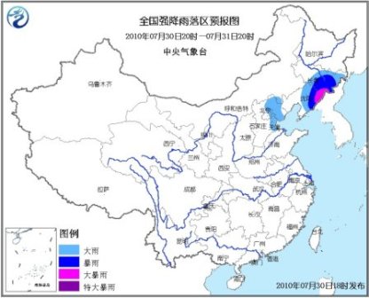 預計,7月30日20時到7月31日20時,河北東北部、京津地區東部、遼寧東部、吉林中南部等地有大雨或暴雨,其中,遼寧東部、吉林南部等地的部分地區有大暴雨;上述局地并伴有短時雷雨大風等強對流天氣。