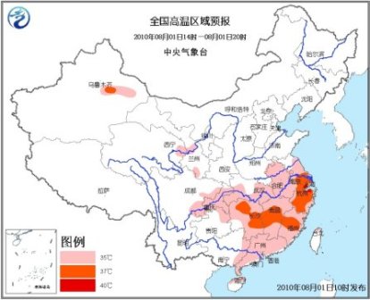預計,今天下午,黃淮南部、江淮大部、江漢南部、江南、華南中東部、四川盆地東部和南部、重慶大部、貴州東北部、甘肅中部以及臺灣北部等地有35~37℃的高溫天氣,局部地區最高氣溫可達38~40℃。