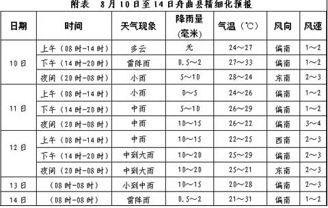 10日,舟曲縣及白龍江流域上游陰天將有陣雨或雷陣雨,降雨量有5~15毫米。