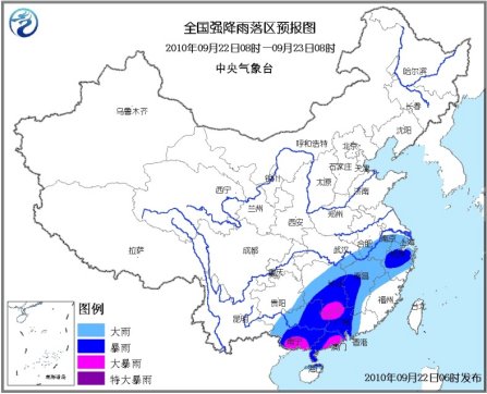 中新網9月22日電 中央氣象臺9月22日06時繼續發布暴雨黃色預警:9月22日08時到23日08時,廣東中西部、廣西大部、海南北部、浙江大部、江西大部、湖南大部、貴州東南部及湖北東部、安徽南部、江蘇南部、福建西北部等地將有大到暴雨。