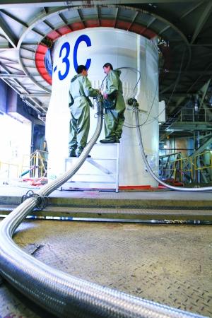 昨日,在西昌衛(wèi)星發(fā)射中心,工作人員對運載火箭加注燃料,“嫦娥二號”發(fā)射進(jìn)入倒計時。張雷 攝