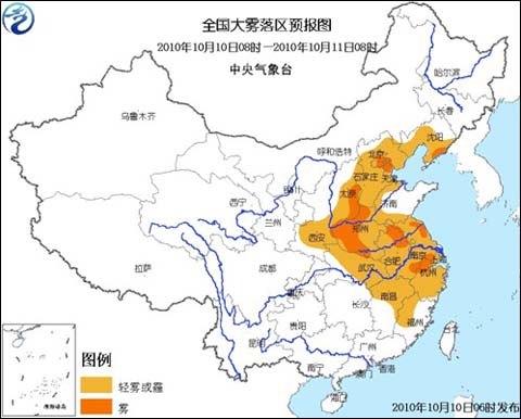 今天上午,遼寧中南部、華北東部和南部、黃淮西部和南部、江淮、江漢北部和東部、江南東部、陜西中部等地有輕霧或霾,其中,遼寧東南部、京津大部、山西東南部、河南西部、安徽北部和東南部、江蘇東北部和南部、浙江北部等地的部分地區有能見度不足1000米的霧,局地能見度不足500米。