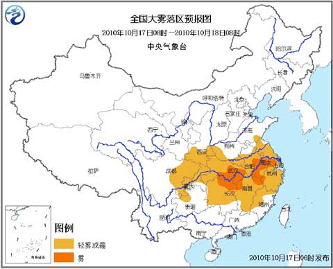 中新網10月17日電 據中央氣象臺消息,中央氣象臺10月17日06時繼續發布大霧藍色預警:預計今天(17日)早晨到上午,黃淮南部、陜西南部、江淮、江漢、四川盆地大部、重慶大部、江南大部、福建中西部等地將有輕霧或霾。