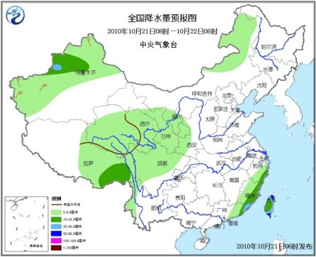 21日08時至22日08時,新疆北部和西部、西藏東部、青海大部、川西高原中北部、內蒙古東北部等地有小雨(雪)或雨夾雪;甘肅中東部、寧夏中南部、陜西西南部、四川盆地西北部、云南西北部、浙江東南部、福建大部、廣東東部、臺灣等地有小到中雨或陣雨,其中,福建東南部、臺灣等地有大雨,局地有暴雨;上述局部地區并伴有短時雷雨大風等強對流天氣。新疆北部、東南部沿海等地有4~6級風,新疆西北部山口地區風力可達8~9級。南海東北部海域的風力將有10~13級、陣風可達14~15級;“鲇魚”中心經過的附近海域的風力將有14~16級、陣風可達17級及以上;東海大部、臺灣海峽、南海西北部將有7~9級大風。