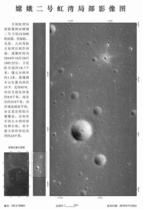 據中央電視臺報道,首次公布的月球虹灣地區局部影像圖是一張黑白照片。據國防科技工業局有關負責人介紹,該影像成像時間為10月28日18時,是衛星距離月面大約18.7公里地方拍攝獲取。影像圖的傳回,標志著嫦娥二號任務所確定的六個工程目標已經全部實現。這意味著探月工程二期“嫦娥二號”工程任務取得圓滿成功。