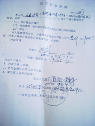 記者現場調查采訪時,發現大多攤主的手中,除了攤位費收款收據外,還有一張由“鎮江市城市管理行政執法局潤州分局”印制的“預交罰款申請”單復印件,申請人是組織者劉某。內容是“本人因占道經營行為,違反了城市管理有關規定,本人愿意接受處罰,自愿預先繳納相應罰款人民幣叁仟元整,待本人事情辦理結束后再來接受進一步處理”。