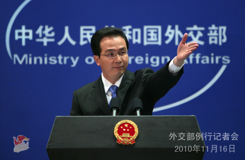 2010年11月16日,外交部發言人洪磊主持例行記者會,就巴以和談、幾內亞大選、中俄印外長會晤等問題回答了記者提問。答問全文如下: