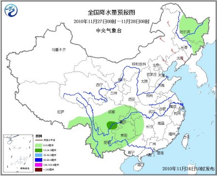 27日08時至28日08時,東北地區北部有小到中雪;西南地區東部、江南西部、廣西西部等地有小到中雨。