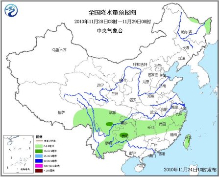 28日08時至29日08時,黑龍江東北部有小雪;江南、西南地區東部、西藏東部有小到中雨。