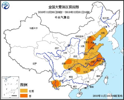 中央氣象臺11月30日18時發布大霧藍色預警: