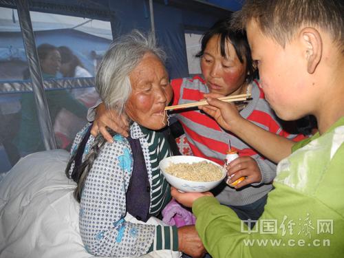 在定西“7·22”地震中,岷縣梅川鎮(zhèn)永光村70多歲的李改花老婆婆一家5口有4人遇難,年僅10歲的外孫子后智斌一夜間變成了“小大人”。他說(shuō)自己要好好孝敬外婆,讓外婆以后的日子過(guò)得幸福快樂(lè)。圖為小后智斌在抗震棚里給外婆喂飯。(記者 黃俊毅 攝)
