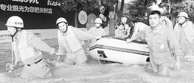 10月10日,來余姚支援的杭州消防支隊武警官兵在余姚市南西路幫助轉(zhuǎn)移被困群眾。
