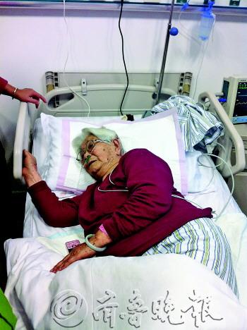 24日,習近平總書記到青島大學附屬醫院黃島分院看望慰問爆燃事故的傷員,87歲的薛淑美是其中年齡最大的。總書記走后,老伴扶著薛淑美躺下休息,兩人的手緊緊握在一起。記者 張曉鵬 攝