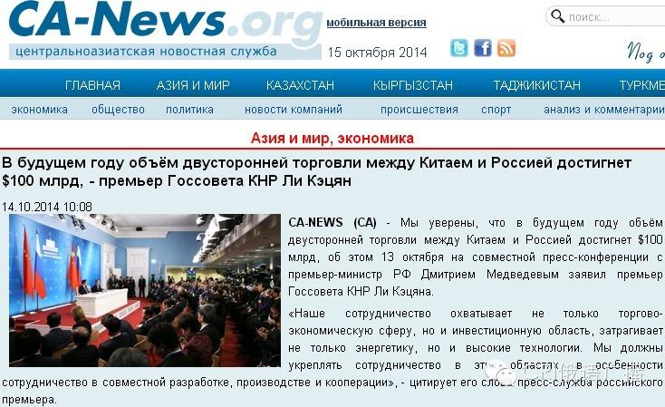 中亞新聞社:中俄雙邊貿易額將達到1000億美元,而中俄合作對中亞地區的發展具有決定性影響,因此,中亞媒體格外關注兩大國的合作動向。