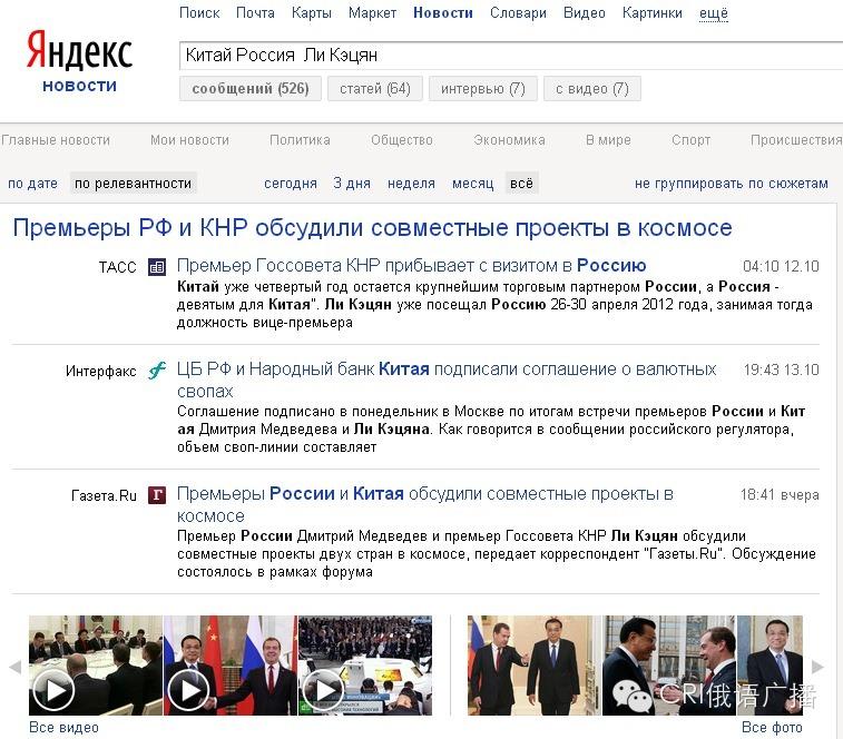 俄羅斯最大的搜索引擎Yandex.ru:當在這里輸入“中國”、“俄羅斯”、“李克強”等詞條的時候,你能夠看到數以千計的消息,內容涵蓋了李總理訪俄期間的所有活動與話題。