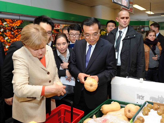 在默克爾的總理府檢閱完儀仗隊,在紅地毯的盡頭,默克爾微微笑,抬起右前臂,伸出大拇指——這是對李克強的一個贊賞?這個小動作饒有趣味。在默克爾領(lǐng)李克強去她經(jīng)常逛的一個超市,李克強要去拿提籃,默克爾擺手制止了他,她自己熟練地拎上提籃,自然而然引領(lǐng)著李克強走上自己熟悉的逛超市線路。很顯然,無論你是否在意他們的職務,他們之間的關(guān)系是老熟人,是朋友。國與國之交往,私人之間的友誼,正是象征,不可忽略。