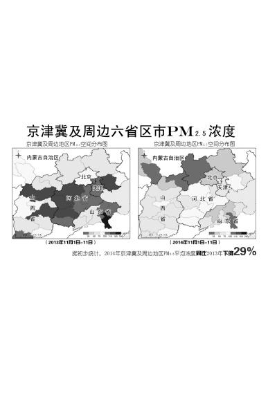 APEC期間區(qū)域大氣環(huán)境遙感監(jiān)測結(jié)果顯示,京津冀及周邊地區(qū)大氣PM2.5濃度同步出現(xiàn)了不同程度的下降,各地空氣質(zhì)量都得到了明顯改善。