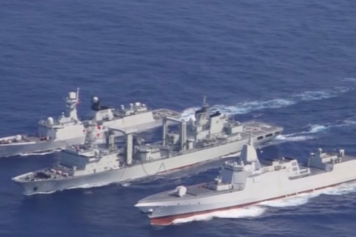 總臺軍事觀察員 魏東旭:演訓畫面顯示,107編隊包括一艘055型驅逐艦、一艘052D型驅逐艦、一艘054A型護衛艦和一艘綜合補給艦。這是一種典型的火力加強型的驅護艦編隊。在編隊當中,055型驅逐艦和052D型驅逐艦能夠利用自身先進的相控陣雷達和遠程的防空作戰體系,為編隊撐起嚴密的防空反導保護傘。