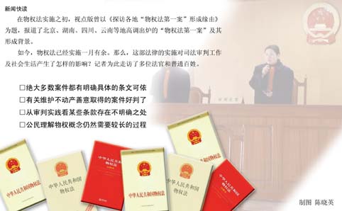 到今天為止,物權(quán)法已經(jīng)實(shí)施一月余。一個(gè)多月來,物權(quán)法對(duì)司法審判及社會(huì)生活有哪些影響?記者對(duì)此進(jìn)行了深入采訪。