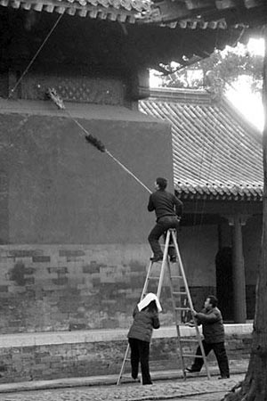 29日上午,記者進入孔廟,發現工作人員正在對大中門、東華門等附近游客出入必經的磚鋪甬道進行精心修復處理。這些甬道都是由青磚鋪成,有的地方由于踩踏過多出現損毀或塌陷,工作人員都重新進行了仔細地鋪裝整理。在奎文閣、碑亭等處,工作人員用加長的雞毛撣子,拂去建筑墻體上的浮塵,使得古建筑更為鮮亮。