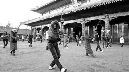 “起……戶……”在《天下大同》的音樂中,36名手持孔雀尾翎的舞者翩翩而起,在他們四周,是28名手持各種樂器的舞者,祭孔樂舞的演員們在孔廟大成殿前,開始進行彩排。另據表演人員介紹,他們近幾天已經排練了多次。演員們的彩排非常嚴格,每個舞步、每個位置,都要非常規范。