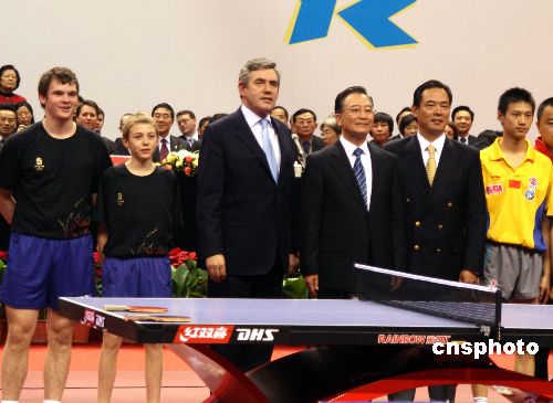 中國總理溫家寶與來華訪問的英國首相布朗,在中國人民大學“世紀館”觀看中英乒乓球友誼賽,并與運動員進行了交流。中新社發 周兆軍 攝