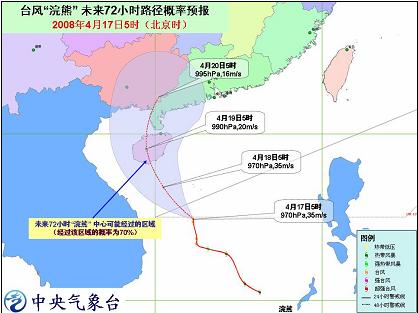 中新網(wǎng)4月17日電 中央氣象臺(tái)今天早晨六點(diǎn)鐘發(fā)布臺(tái)風(fēng)橙色警報(bào):今年第1號(hào)臺(tái)風(fēng)浣熊(NEOGURI)的中心今天早晨5點(diǎn)鐘位于海南省三亞市東南方向大約480公里的南海中部海面上,就是北緯14.9度,東經(jīng)112.3 度,中心附近最大風(fēng)力有12級(jí)(35米/秒)。