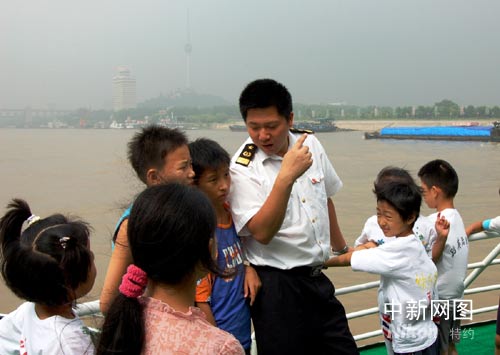 武漢市部分中小學20余名師生登上剛剛投入使用的內河最先進巡航救助船——長江海事2號,饒有興致地聽著武漢海事局現場執法人員講解海洋知識和長江航運發展史。武漢海事局青年志愿者在漢口江灘分別向過往市民分發“航海日”宣傳資料100余份。
