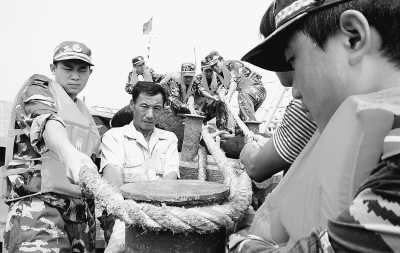 圖為7月26日,浙江臺州礁山港,邊防官兵幫助漁民加固纜繩,以防范臺風“鳳凰”。郟 策攝