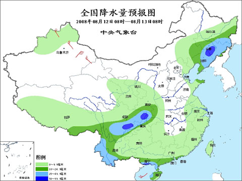 2008年8月12日8時(shí)-8月13日8時(shí)全古偶降水量預(yù)報(bào)圖